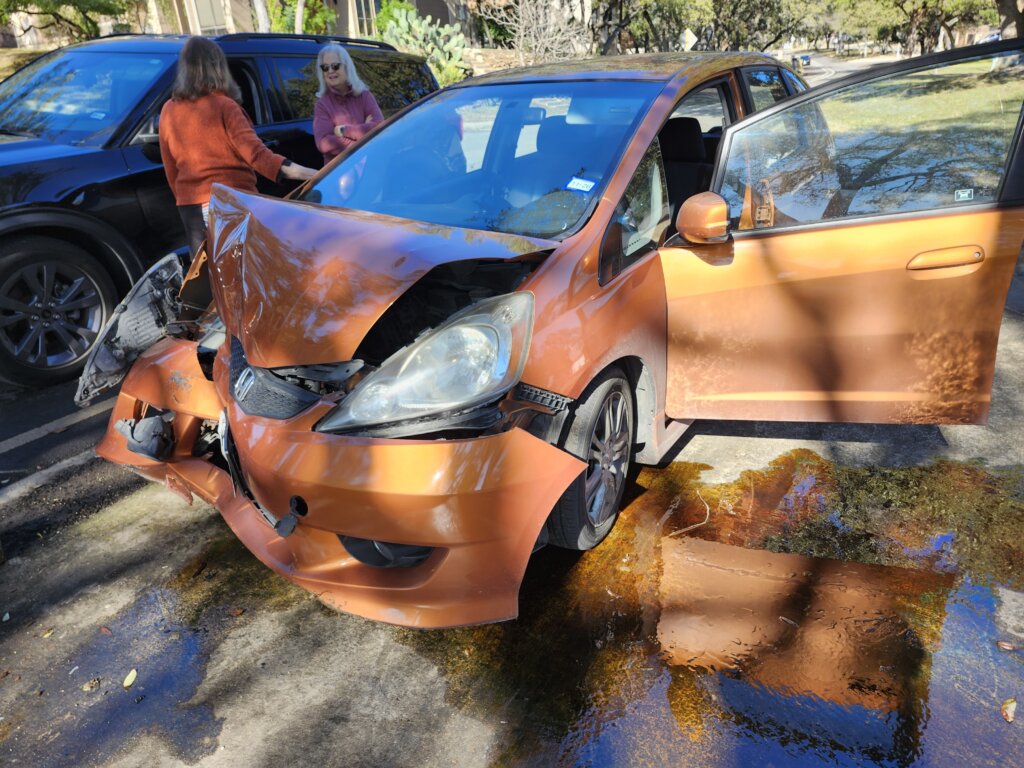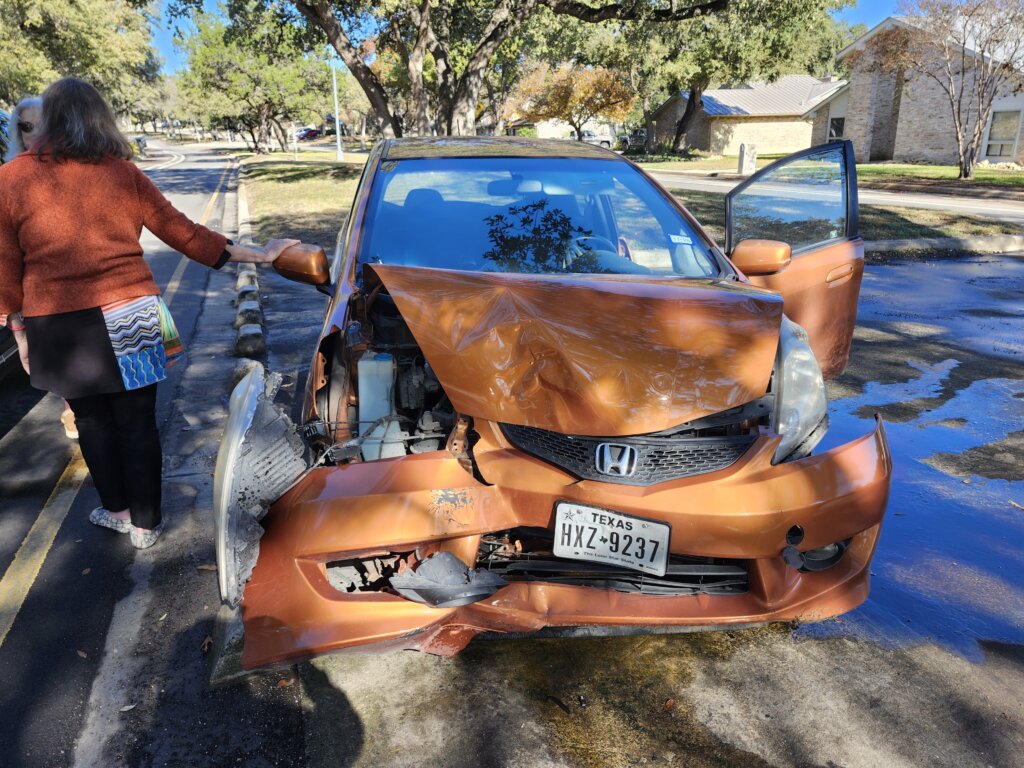 A freak one-car accident connected me with the steering wheel first, and then when I hit the tree, the air bag deployed. It is truly a miracle from God that I walked away with no broken bones.