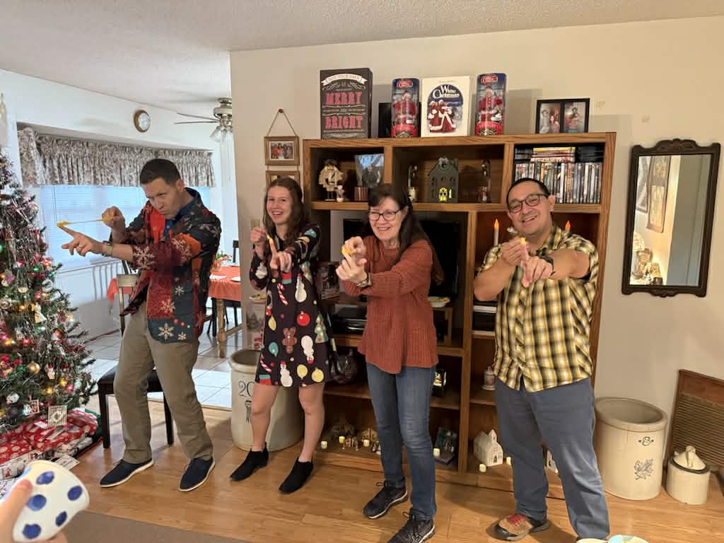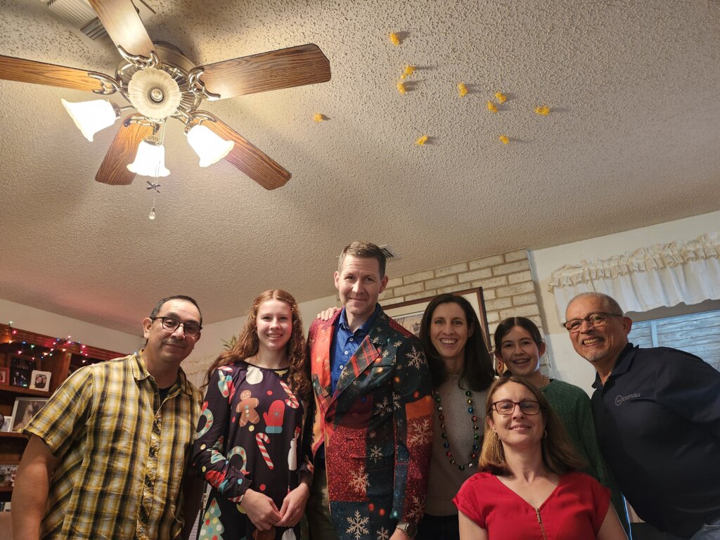 This holiday season has been full of the highest highs and the lowest lows. Photos below are of (1) the hardest event by far, my little brother, Dick, who passed away the week of Thanksgiving from leukemia, (2) my little Honda Fit that I totaled the week before Christmas by hitting a tree head-on, (3) candy cane cookie making with my daughters and granddaughters, (4) my granddaughters’ (ages 12 and 15) piano recital and (5) school Christmas play, (6) seeing the play of “White Christmas” in the Seguin historical theater with my girls and their daughters, (7) riding the Christmas train at the Train Museum—a yearly event, ( 8 ) and the gift exchange at our house that got a bit rowdy. (Tiny rubber chickens ended up stuck to the ceiling! Pictures at the end.)