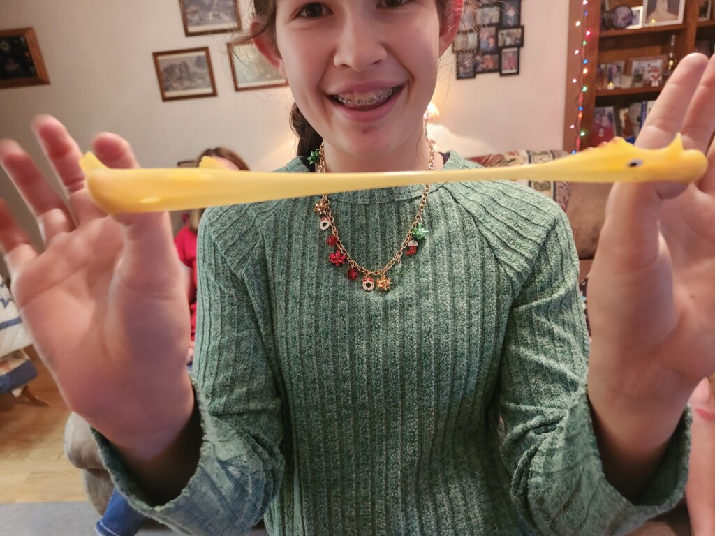 We play lots of games before we unwrap gifts, and this year I included a game with some mini rubber chickens…